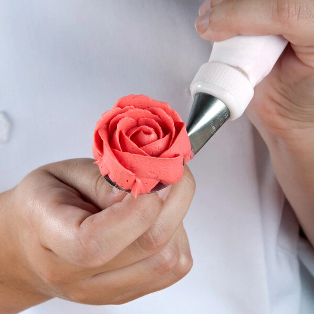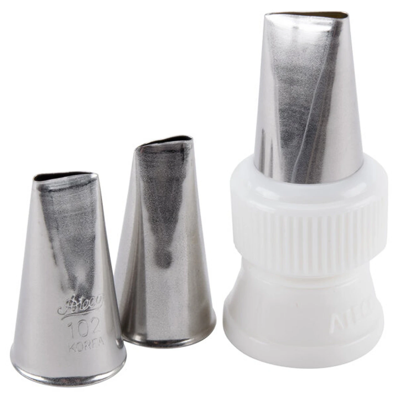 Create elegant, rose-shaped frosting designs for cakes, cupcakes, edible decorations, and more with this Ateco 383 rose pastry tube set! This 4-piece set contains a plastic coupler and tubes 101, 102 and 104, made of stainless steel. Perfect for bakeries, cafes, bistros and more, this rose tube set is an ideal addition to your pastry tools. With a variety of sizes to work with, you can create more elaborate designs to impress your patrons and take your cake decorating to a whole new level. Using the right sized pastry tube for the job will enhance your presentation to draw patrons’ attention to your display cases and plated desserts.