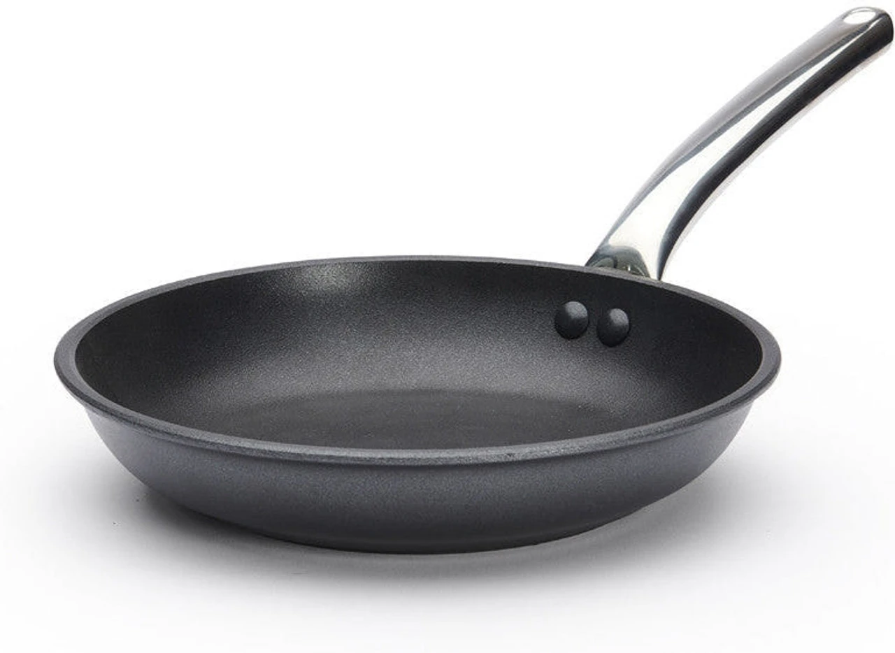 This pan is your trusted companion for maintaining precise cooking conditions. Its extra-thick base serves as a buffer, preventing abrupt and undesirable reactions when exposed to high heat. With this fry pan, you have complete control over your cooking process, whether you’re searing, sautéing, or frying. The ergonomic stainless steel handle is securely riveted and remains cool during cooking, guaranteeing a comfortable and safe grip. You can confidently maneuver the pan around the kitchen without the need for oven mitts or potholders.