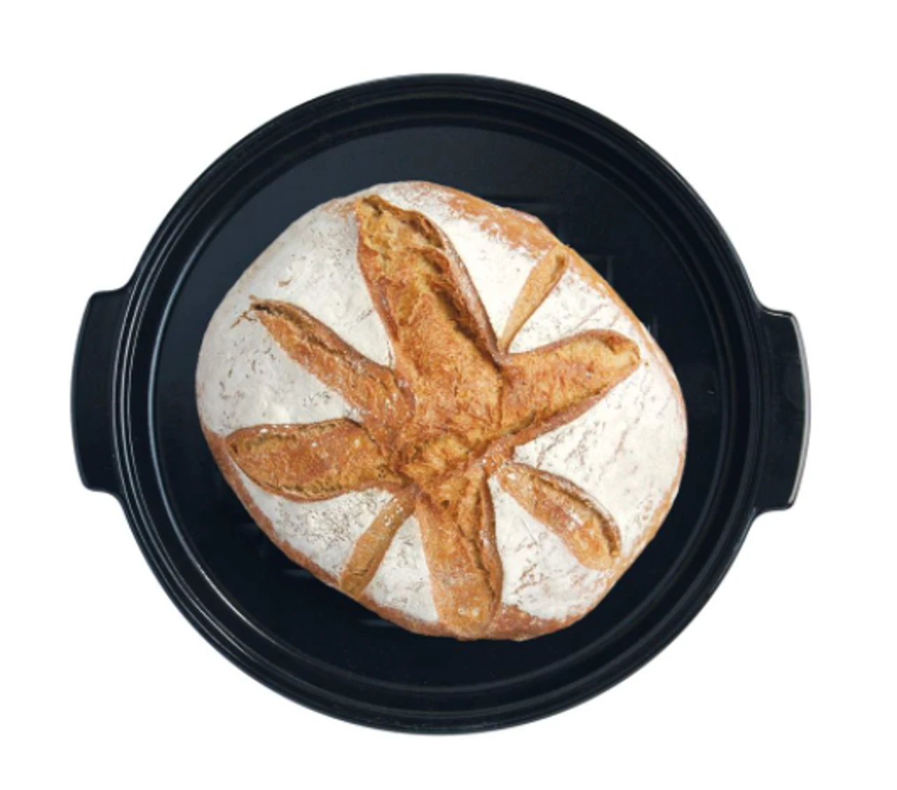 The highly resistant glaze and the criss-cross pattern on the platter prevent the loaf from sticking and make cleaning easy. The Round Bread Baker is the ideal tool for baking your crusty homemade bread !