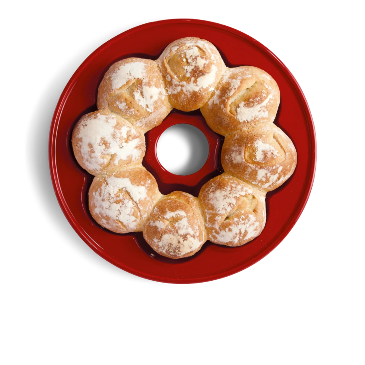 Emile Henry’s Crown Baker allows you to make a ring of 8 light, crispy, small bread rolls. Simply divide the dough into eight even pieces, place them in the floured cavities, cover with the lid and place in the oven.
