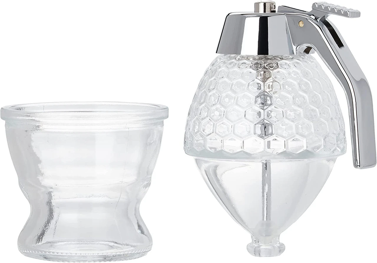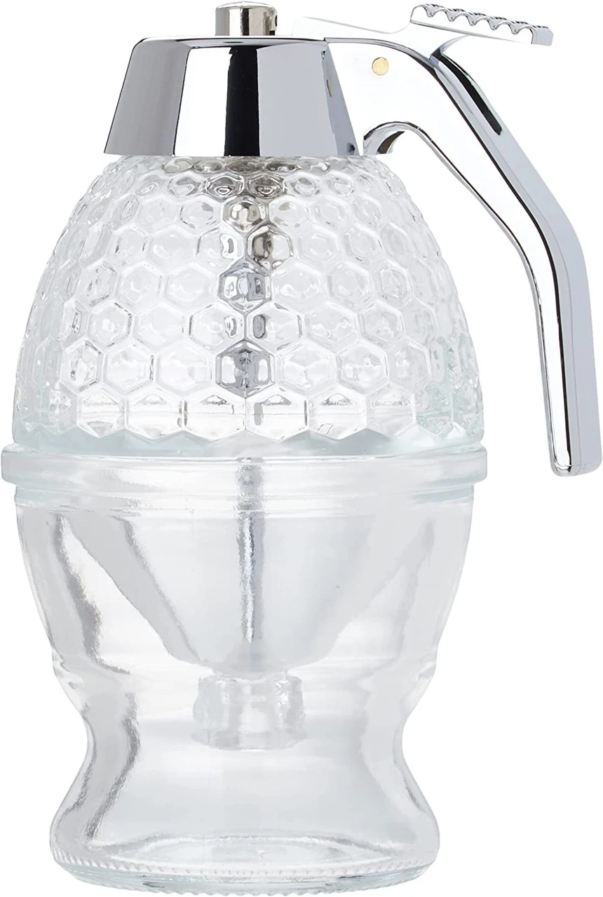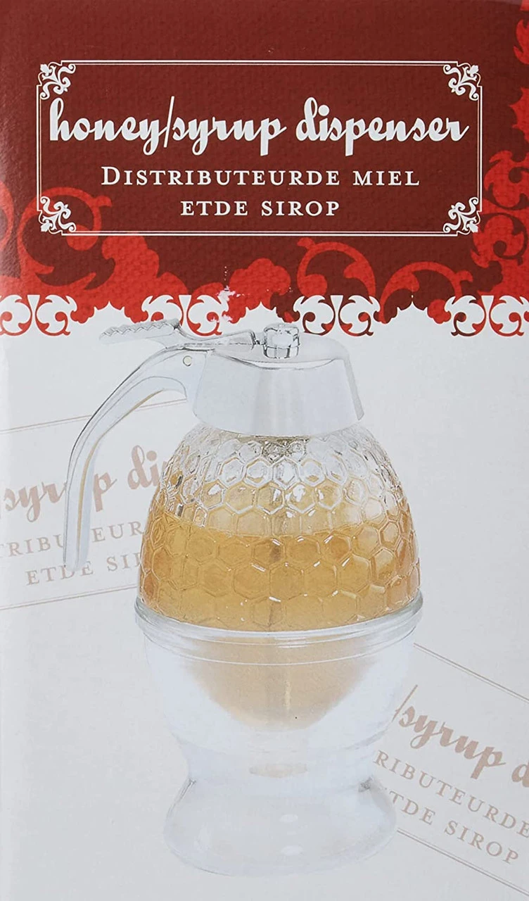 - Get a perfect pour of honey with a convenient and decorative place to store your honey with this Fox Run glass honey dispenser! This dispenser is made of clear glass, with honeycomb indentations adorning the sides to add some extra embellishment. The dispenser is easy to clean and to use, with a thumb lever on the handle for easy pouring.