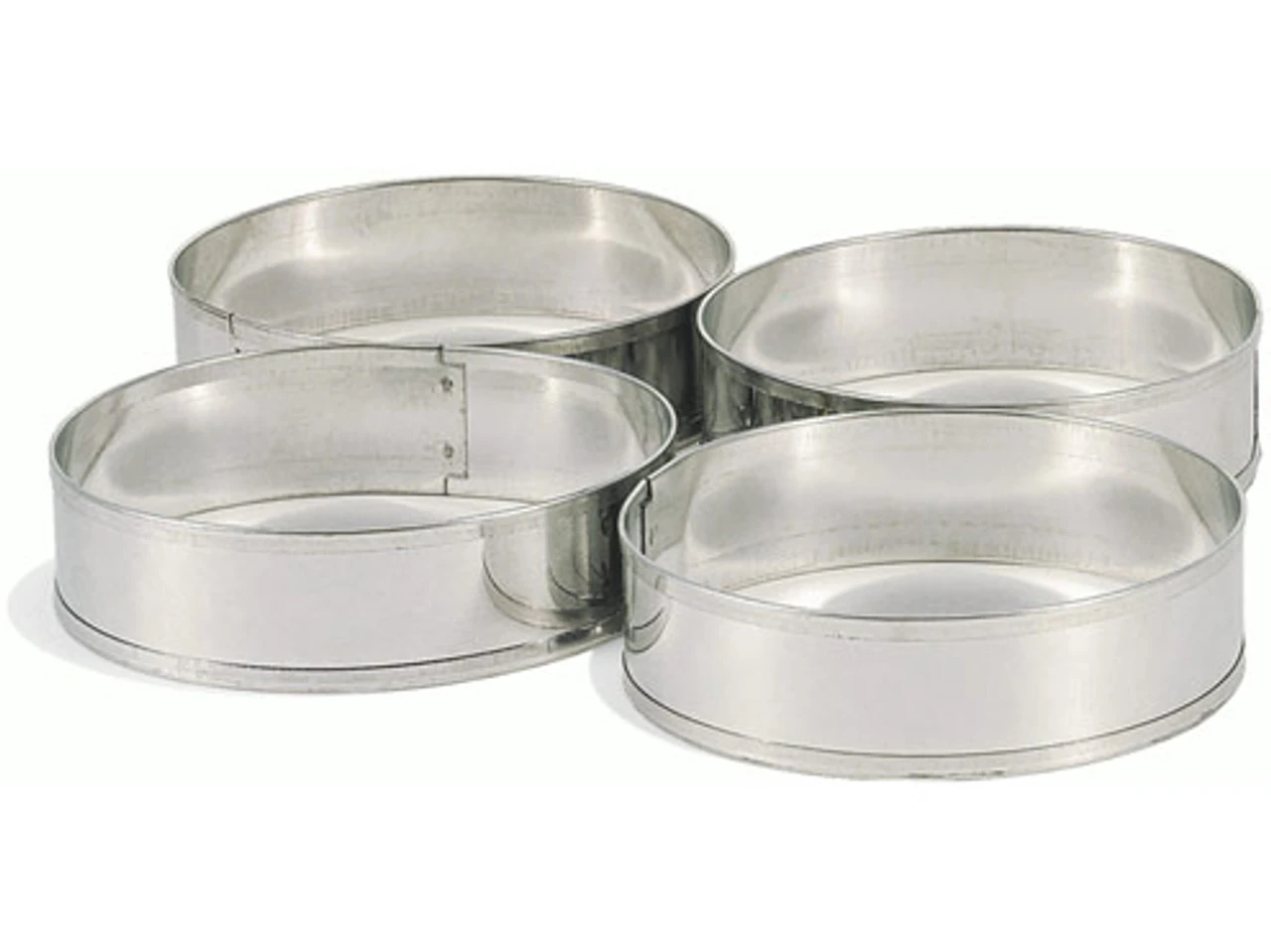 Rings like these give English muffins their characteristic shape. They are often preheated with the griddle, then batter is spooned into them and the muffins are cooked on one side before the rings are removed and the muffins flipped over to finish cooking. Packaged four to a box, the rings can also be used to make perfectly round pancakes and sunny-side up eggs, or they can double as biscuit cutters.