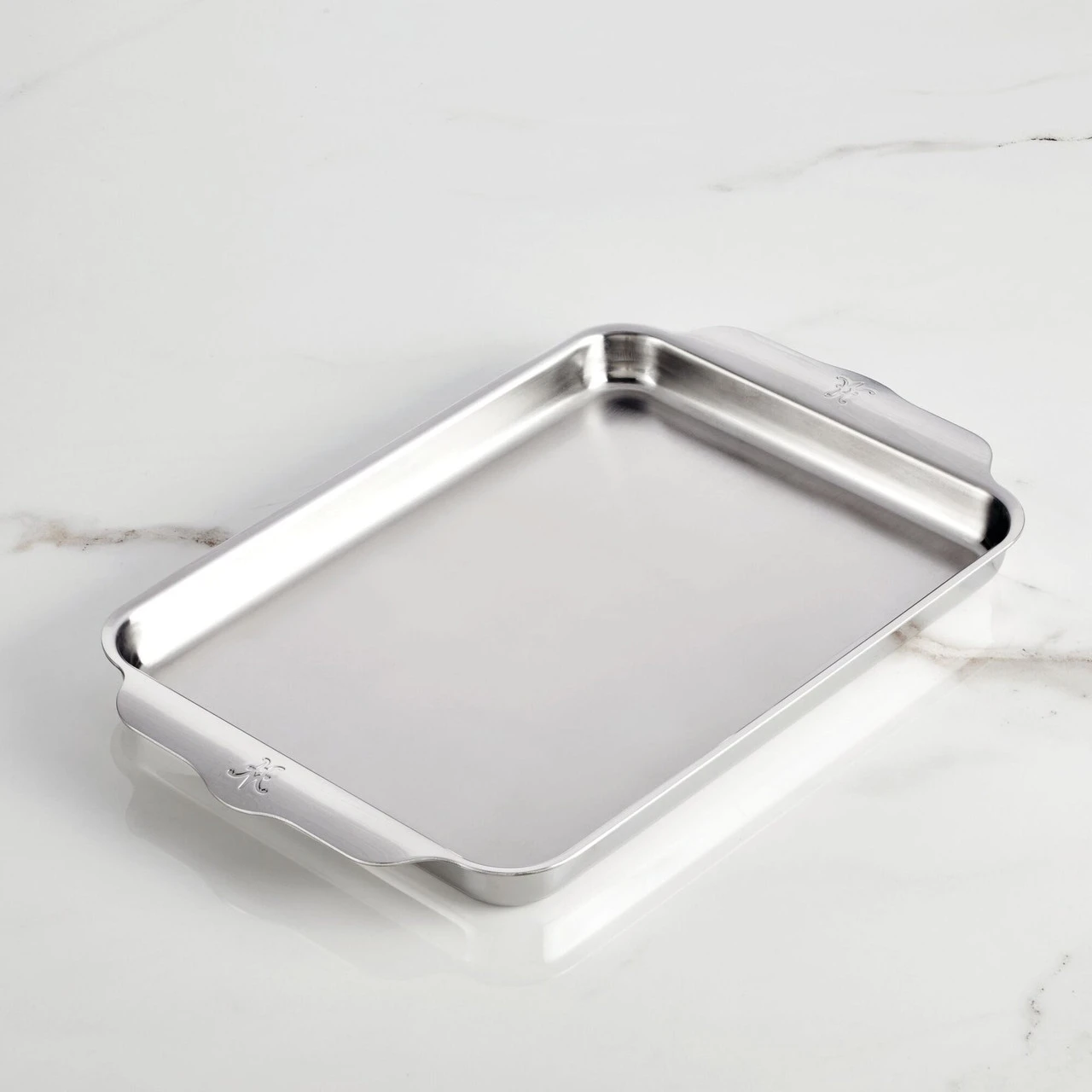 Introduce exceptional craftsmanship and lasting performance to the kitchen with the Hestan Provisions OvenBond Stainless Steel Quarter Sheet Pan. This quarter sheet pan is crafted from triple-bonded clad stainless steel with a responsive aluminum core designed to evenly emit heat, producing beautifully browned goods and perfectly roasted foods. Warp-resistant clad pan features wide curved handles, providing an easily accessible, firm hold when removing from the oven, even when wearing oven mitts. Brushed stainless steel interiors and polished exteriors give these pans a lasting aesthetic that keeps them looking newer, longer. This gourmet roasting pan is broiler safe and oven safe to 600°F to accommodate a wide range of recipes.