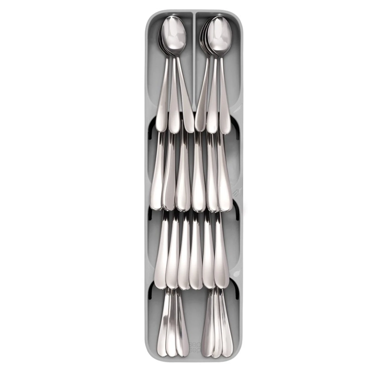 Keep your kitchen drawers in order with this compact storage solution. The unique tray features angled, over-lapping cutlery compartments that take up less room so you can combine two drawers into one.