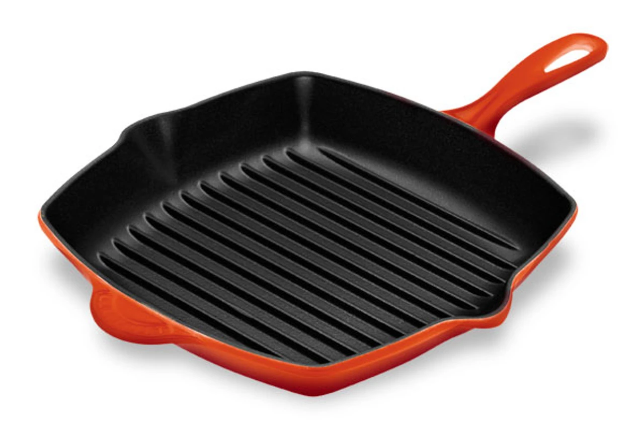 The square Skillet Grill is available in a wide range of exterior colors, and its interior is coated with Le Creuset’s protective satin black finish to prevent damage and wear. Over time, this slightly abrasive interior develops a natural patina that is ideal for searing and frying.