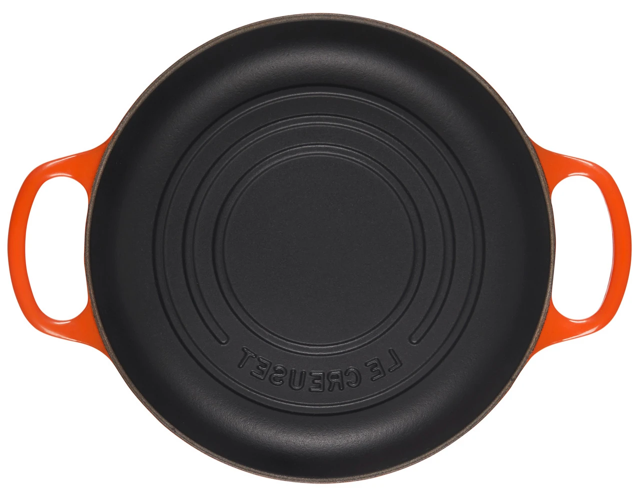 produces a golden, crispy crust marked with our hallmark three rings. With an easy-to-clean matte black interior enamel