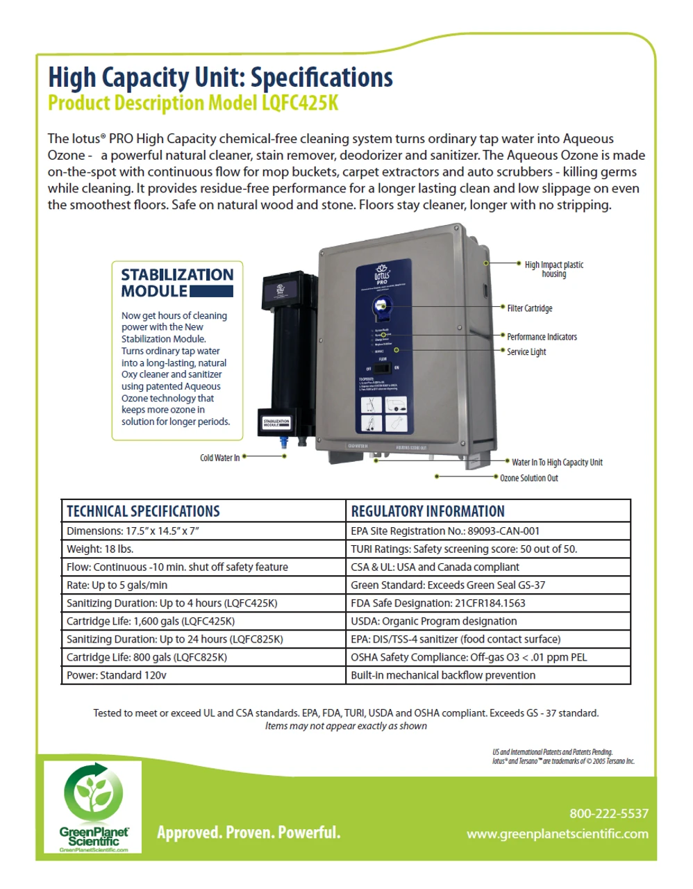 SSS Lotus PRO High Capacity with Series I Stabilization Module: are the ideal match to create an effective but safe and natural cleaning system for your business. Using the lotus® PRO technology, ordinary tap water mixed with oxygen transforms into aqueous ozone which works faster and more effectively than a chemical cleaning solution. As a natural all-purpose cleaning and sanitizing agent, lotus® PRO works for hours, after which point it converts back into water and oxygen. The lotus® PRO system creates an effective cleaning solution for all applications in any industry.