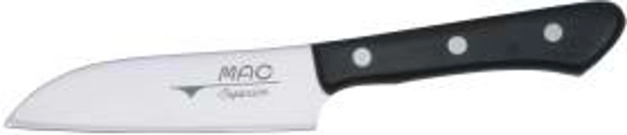 This 4″ paring knife was designed as a miniature version of the Santoku to function both as a paring knife and as a small utility knife. The up-swept handle and taller blade profile allows greater knuckle clearance so that it can be used on the cutting board to chop and slice small items. The 4″ length is still short enough to comfortably peel/pare.