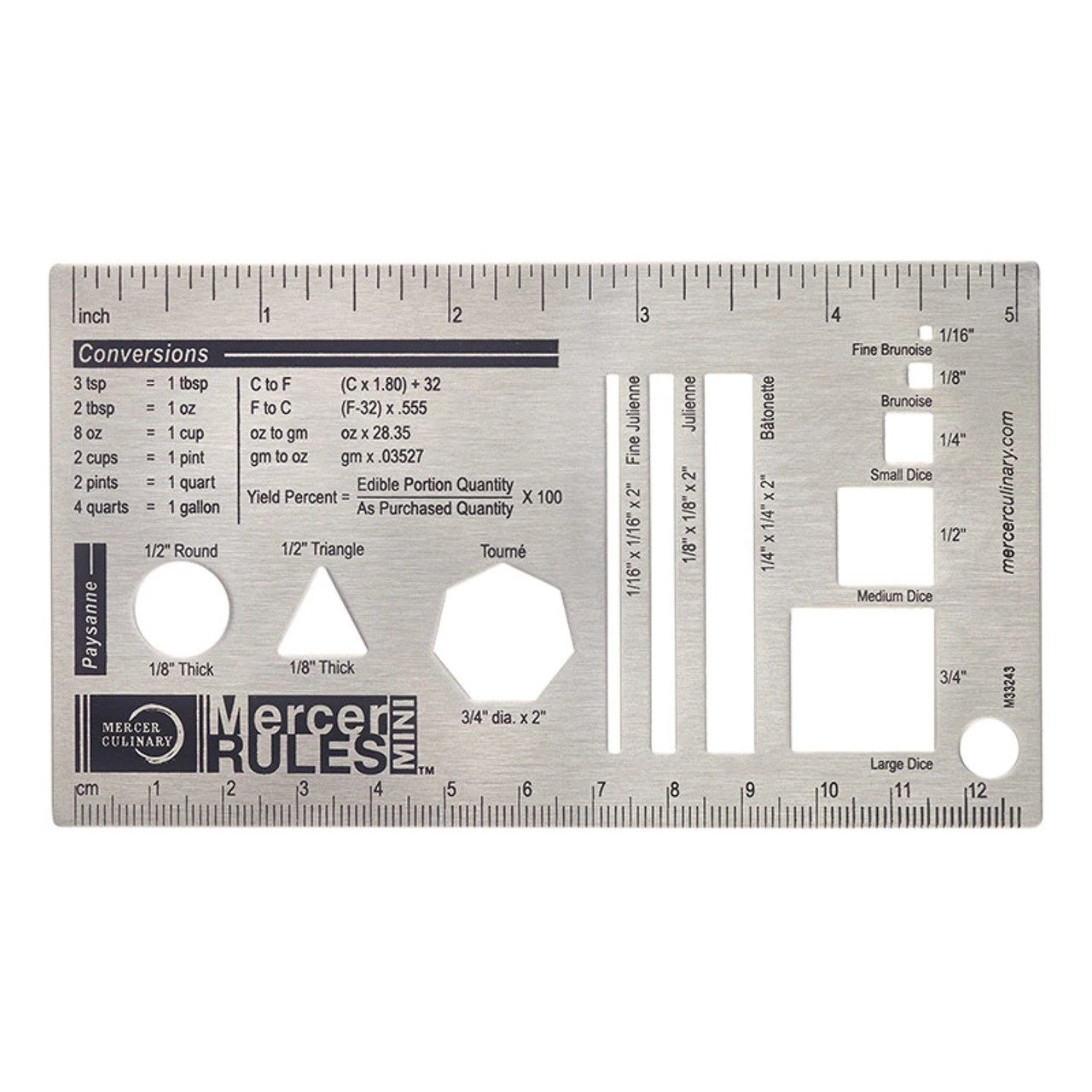 This Mercer Culinary reference tool features a wide variety of helpful measurements, conversions, and guidelines. From fine brunoise to large dice and fine julienne to batonette, it is an essential tool for perfecting culinary training fundamentals. It also includes cooking and storage temperatures for different types of meat and paysanne guidelines. Plus, this guide’s super-slim stainless steel design occupies minimal space during storage and is easily wiped clean!