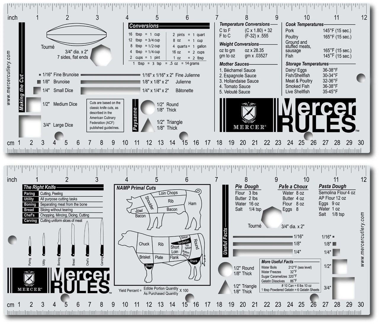 - 2-sided tool with rulers, conversion charts, cutting sizes, and useful facts in everyday cooking
