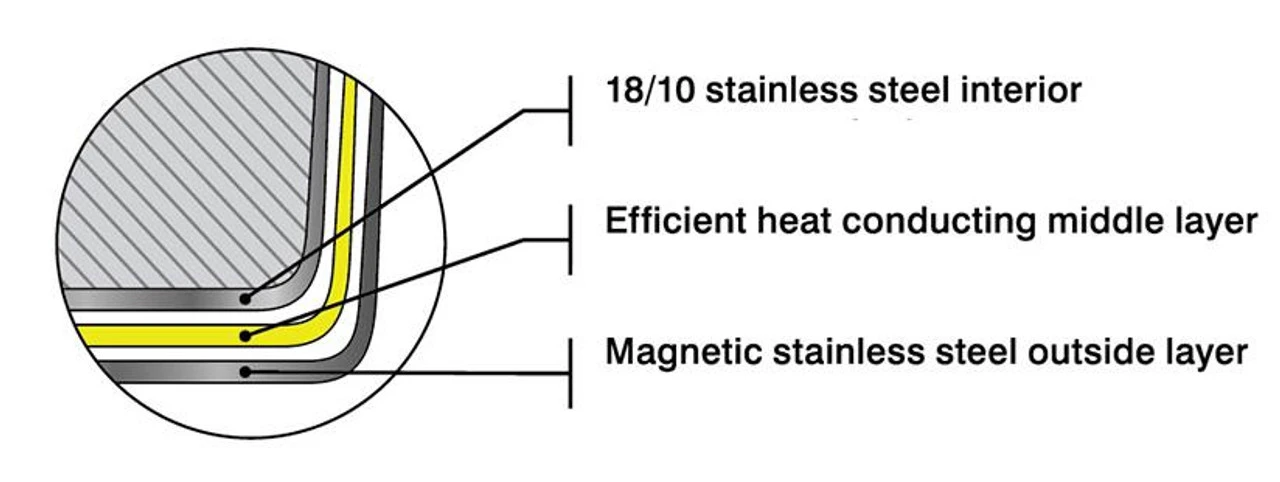-Tri-Ply Clad Design combining 18/10 stainless steel, an aluminum middle core and magnetic exterior steel for fast, and even heat control so food cooks beautifully like it does on cooking shows.