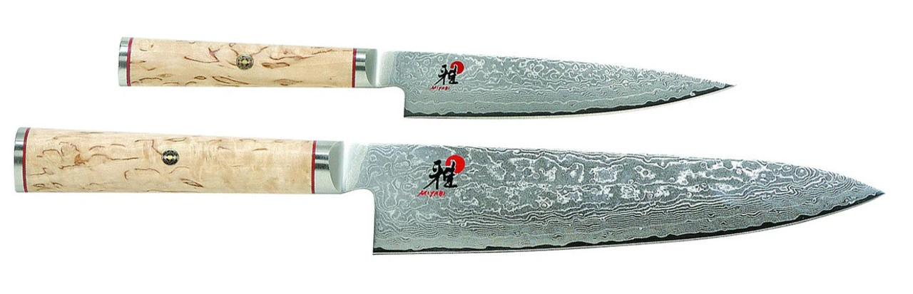 Top-of-the-line MIYABI Birchwood is a work of culinary art. Both blade and handle are crafted from the most precious materials, which shape their striking appearance. More than meets the eye, the potent core of SG2 micro-carbide powder steel is protected by 100 layers of steel. MIYABI’s innovative, ice-hardening process locks in the long-lasting sharpness of the CRYODUR blades. Beneath its beautiful exterior, the flower Damascus pattern provides added durability. The scalpel-like blade is complemented by an equally striking Karelian (Masur) Birch handle. A prized material for knife handles, Karelian Birch is also the only wood ever used in a Faberge egg. Exquisite and ergonomic, MIYABI Birchwood knives feel as good as they look. Handcrafted in Seki, Japan.