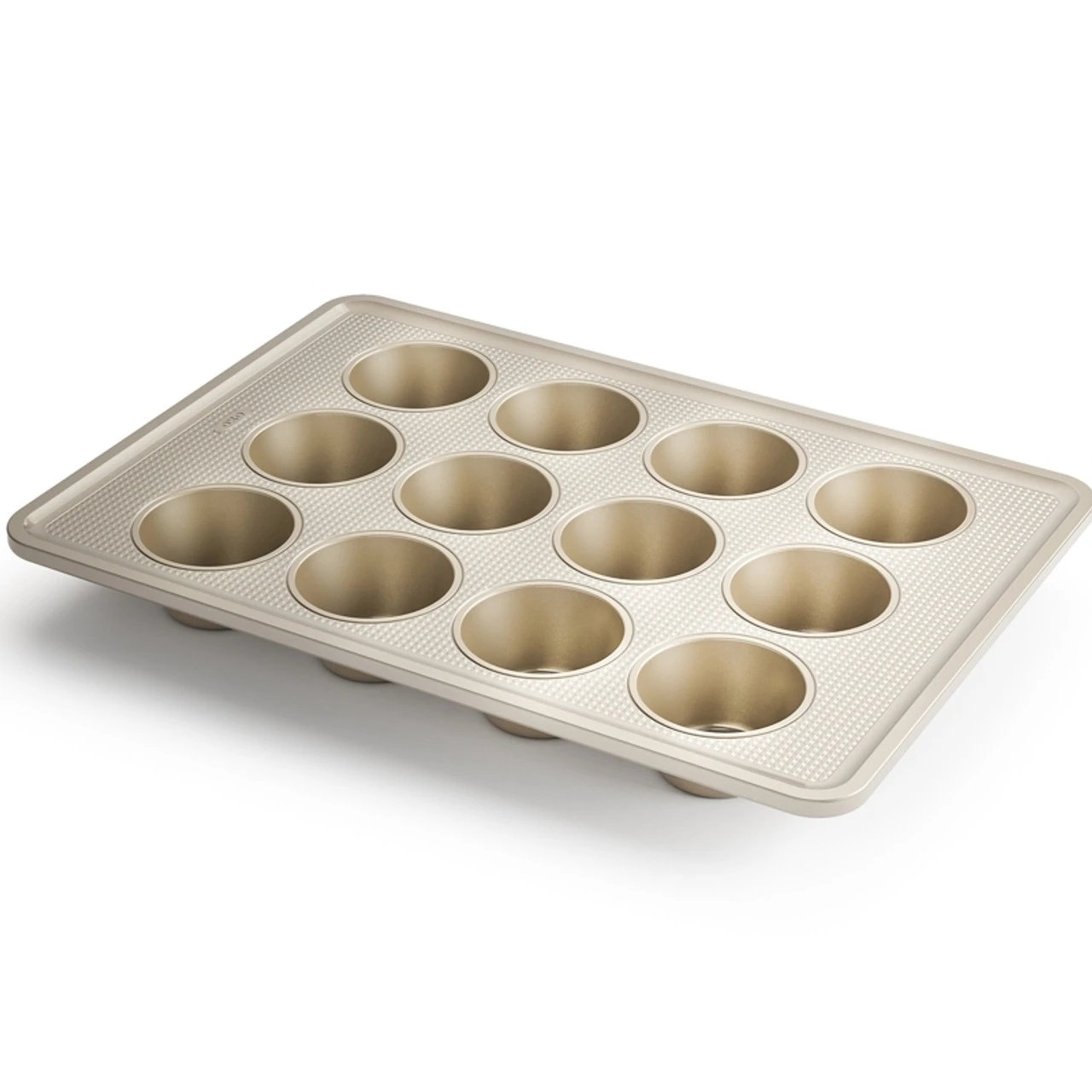 12 cup Muffin Pan, 16.5 x 11.75″ / 42 x 30cm, non-stick, BPA free. Perfect for muffins, cupcakes and mini quiches. OXO’s line of commercial-grade Bakeware provides professional quality, exceptional durability and superior performance. Each pan is constructed with ILAGâ„¢ technology, a Swiss-engineered, PTFE, ceramic-reinforced, two-layer, commercial-grade coating that provides the ultimate non-stick food release. This feature makes it resistant to scratches, stains, corrosion and abrasions. The micro-textured pattern ensures even baking by minimizing surface contact and promotin g airflow, and adds structural rigidity to help prevent warping. Visible pan dimensio n markings on top surface allow for quick and easy size identification. Dishwasher safe.