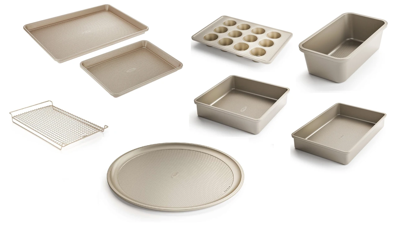 Made in the USA, OXO Metal Bakeware brings you the same best-in-class quality and performance found in commercial bakeware. The Set is constructed from heavy-gauge aluminized steel for stability, even heat distribution and durability for years to come. The Swiss-engineered, ceramic-reinforced, two-layer coating allows for easy food release while protecting against scratching, staining and corrosion. The micro-textured pattern minimizes the Pans’ contact with food for more airflow and even baking. The square-rolled edge adds structure and provides a secure grip. Hand wash only.