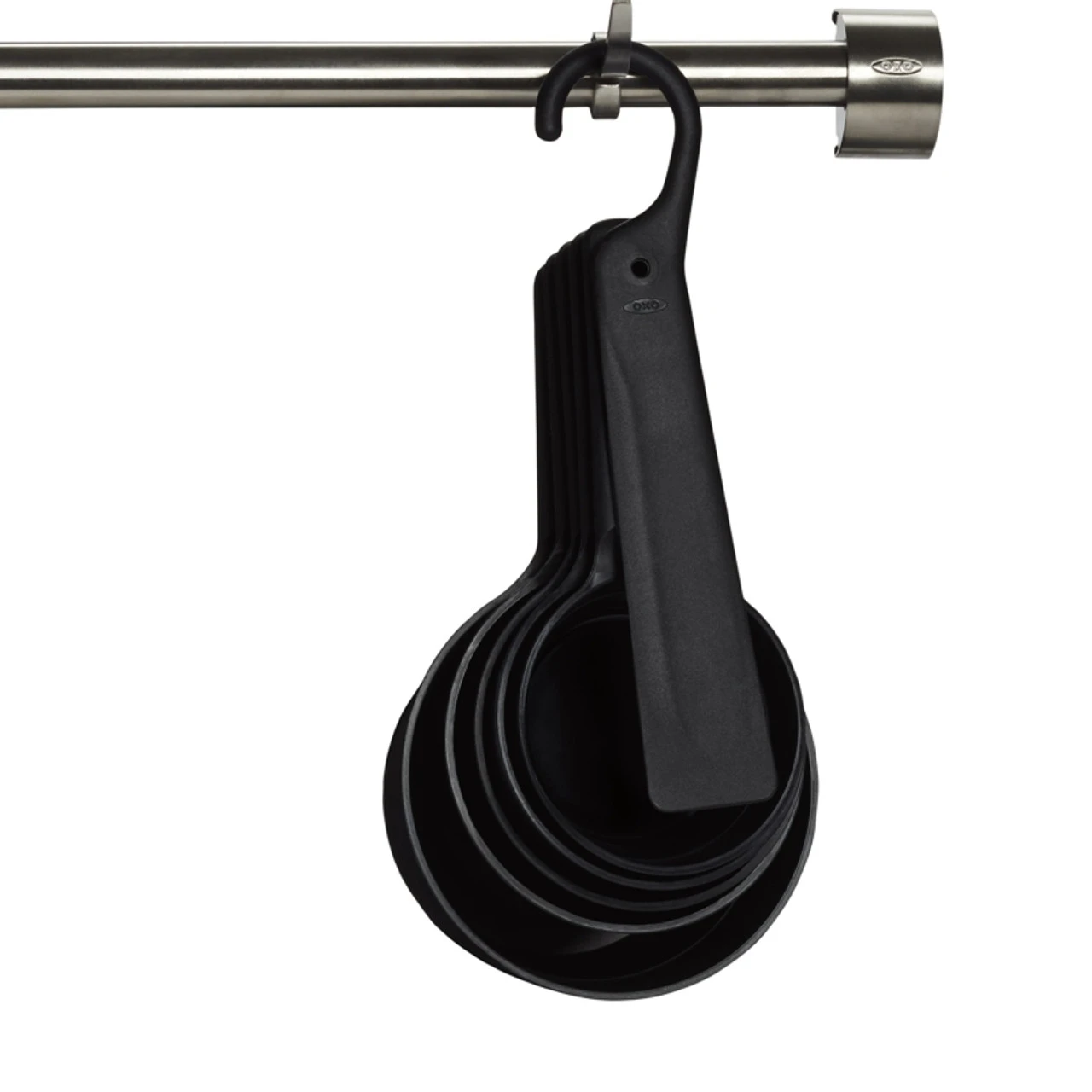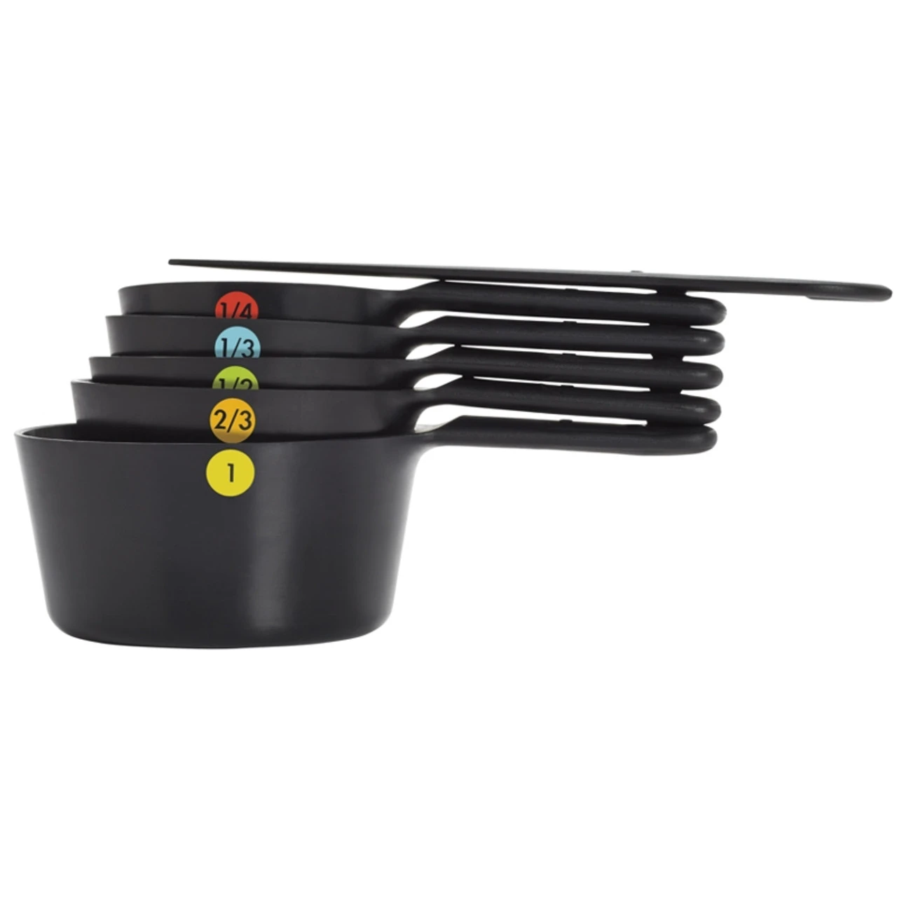 6-piece Measuring Cup Set, black, plastic, BPA free. These Good Grips measuring cups are perfect for all your culinary tasks, including a handy complementary scraper for getting the most out of your ingredients. Unique snapping feature keeps cups together. Measurement marks on handles and sides