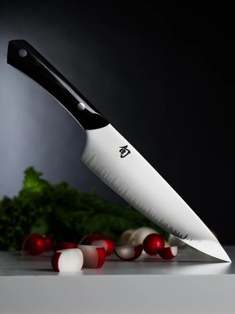 The Shun Narukami 8″ Chef’s Knife, also known as the “French” or “Cooks” knife, is the most important knife in the home or professional kitchen. Whether cutting, chopping, or slicing, no other knife is as versatile as the multi-purpose chef’s knife because it is a designed to perform a variety of common cutting tasks rather than excelling at any one. The upward curve of the knife’s edge allows for a rocking/chopping motion that allows for fast, fine mincing of small foods such as garlic, herbs, or ginger. The wide, flat blade is also excellent for pressing or smacking garlic cloves and popping them out of their papery husks. The chef knife’s extra width also makes chopping larger vegetables easy because it keeps your knuckles off the cutting board. In a pinch, it will even work for slicing and carving tasks due to its length and fine balance.