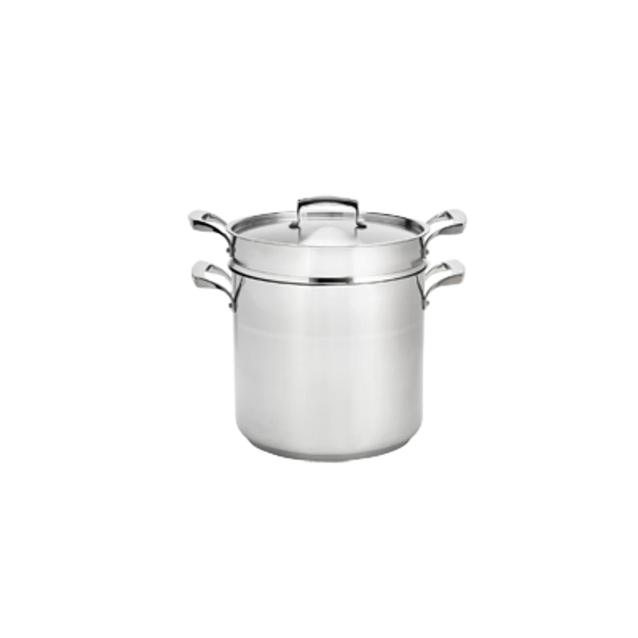 This double broiler from Browne Foodservice has Thermalloy 1150 grade aluminum construction, which provides the perfect balance of heat conductivity and durability. The slow, gentle heat provided by the Thermalloy double broiler ensures perfect results for preparing delicate food items like custard, hollandaise sauce, or melting chocolate. This 8 qt. double boiler includes a pot, insert, and cover.