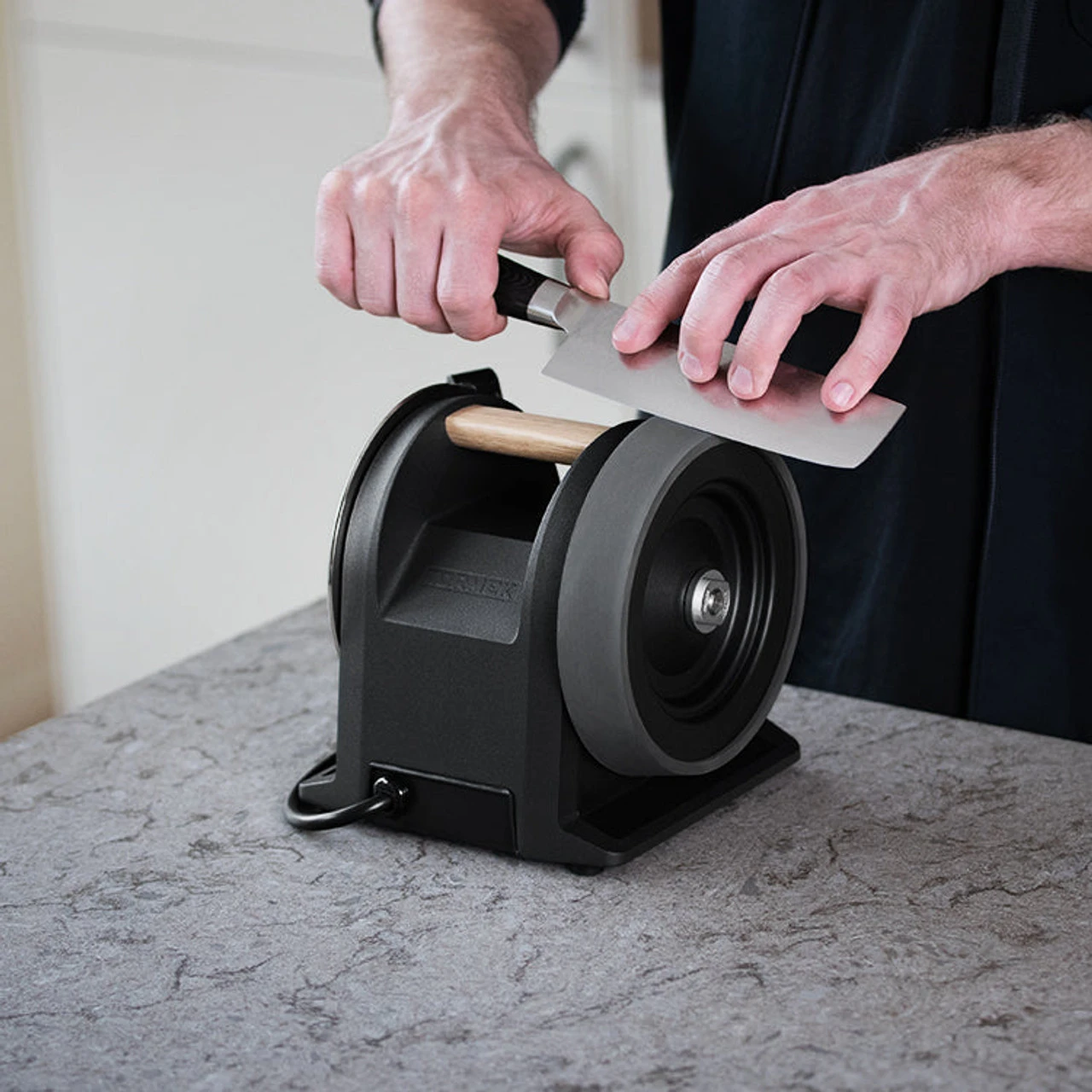 The T-1 Kitchen Knife Sharpener has a sleek, subtly industrial design that gives it a natural place in the modern kitchen. Because whether you’re cooking in a restaurant or at home in your own kitchen, the chef’s most important tool is not a knife, but a real knife sharpener.