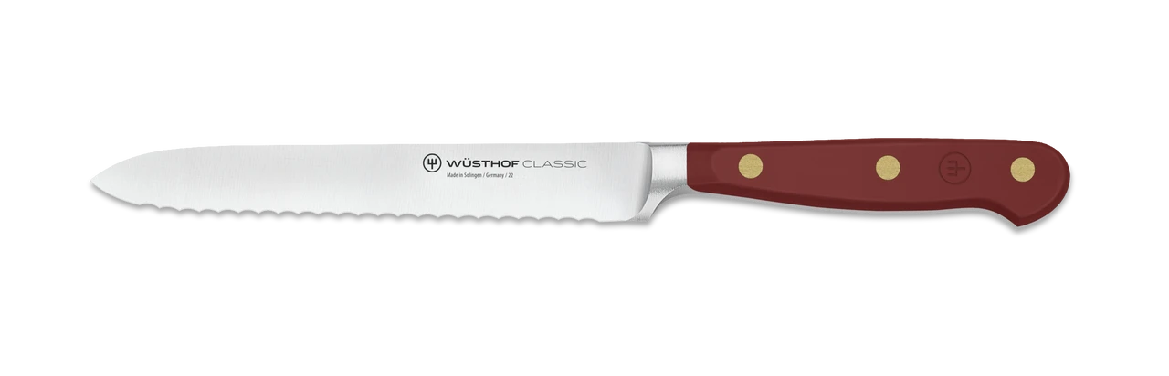 The perfect companion at brunch or for preparing your packed lunch! Thanks to its fine, serrated edge, the WUSTHOF Classic Serrated Utility Knife not only cuts cleanly through sandwich rolls without tearing, but it is also suitable for vegetables (such as firm tomatoes), fruit, or dry sausages. This serrated utility knife is ideally found alongside the WUSTHOF Classic Soft Cheese Knife or the WUSTHOF Classic Hard Cheese Knife.