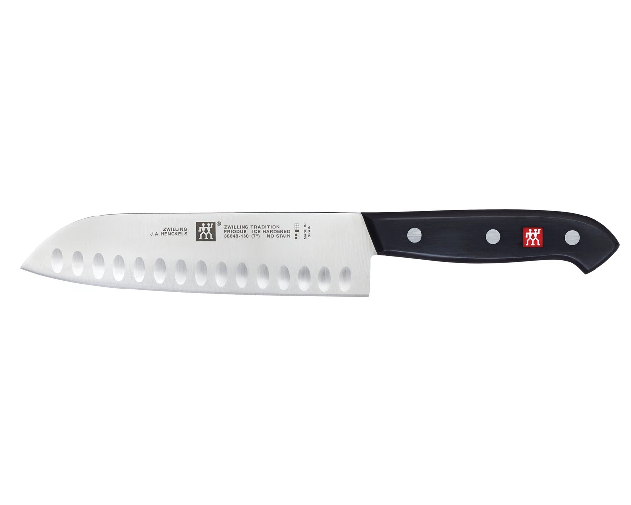 The Santoku knife is the all-rounder for Asian cuisine used in preparing fish, meat or vegetables. Where the Chef’s knife has a curved blade and a high tip, the Santoku blade is much straighter with a low tip. Versions of this knife are manufactured with either a standard-edged blade or a hollow ground edge, also known as a granton edge. The purpose of the granton style blade is to assist with keeping particles from sticking to the knife edge as it cuts, as well as to reduce friction for an easier and faster chopping motion.
