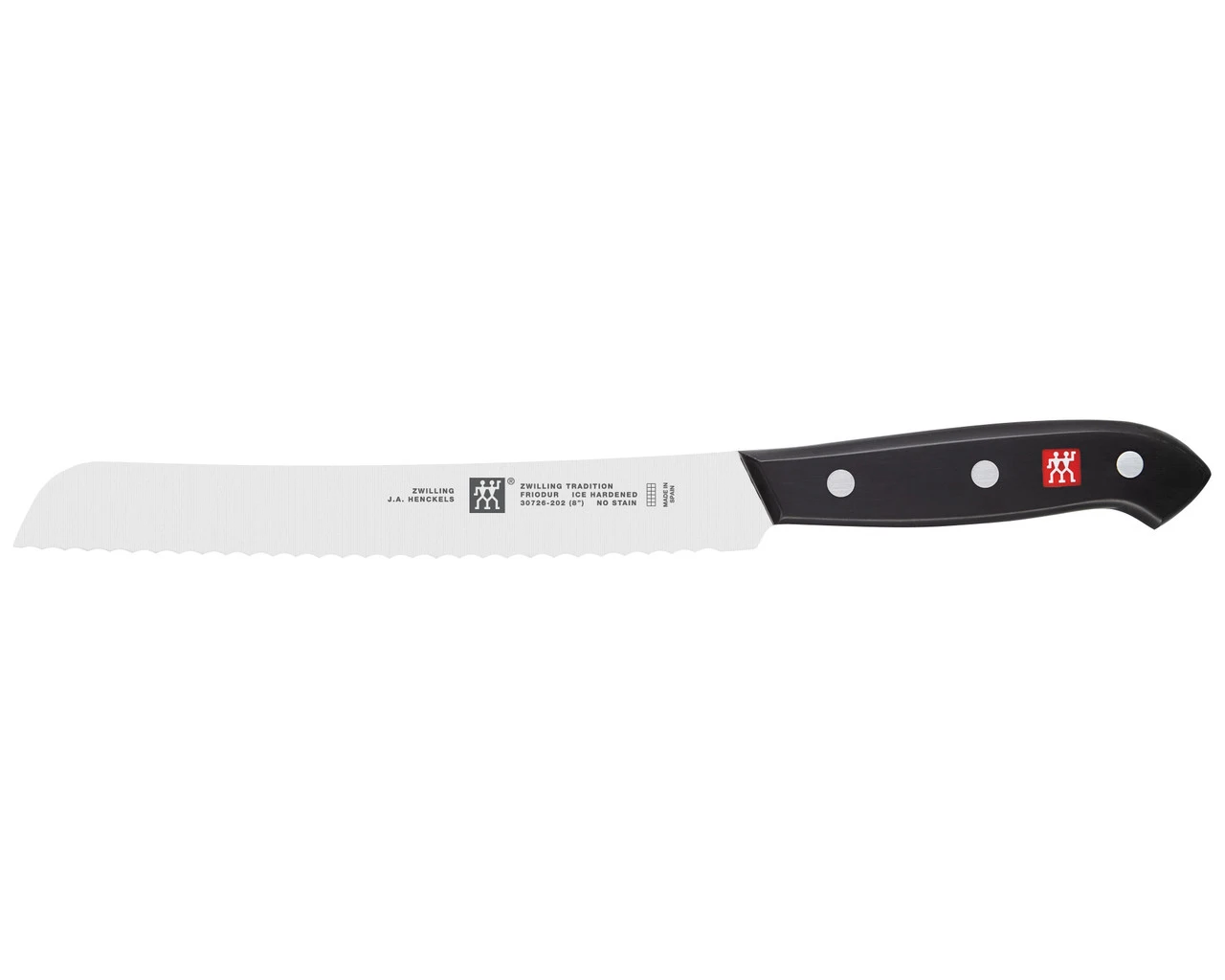 Lighter than bolster knives and an excellent choice for ambitious hobby chef, ZWILLING Tradition is precision stamped from out high performance “NO STAIN” stainless steel. Featuring an ergonomic 3-rivet handle with an embedded TWIN; logo, these knives deliver exceptional value without compromising quality or performance. Bread Knife: A longer knife incorporates a scalloped edge to cut hard crusts effortlessly and evenly.