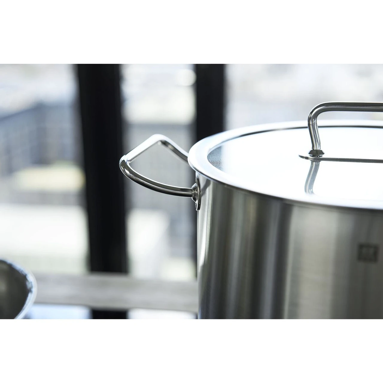 We’re confident that if you want to be your own chef you will love the high-quality cookware of the ZWILLING Pro series. The series sets the standard in quality, variety and, above all, design that is inspired by the most popular designs of the chefs. A high-rim pot for high demands. The high-rim stock pot measures 24 cm across and offers a huge capacity volume with ample space for stirring without spilling. The practical measuring scale integrated on the inside of the pot reliably shows you how much liquid is held by the stock pot. The SIGMA Classic+ sandwich base features multiple layers that ensure even heat distribution all the way to sides and which store the heat for an especially long time. But the pot also scores points on its looks: the 18/10 stainless steel boasts a refined and scratch-resistant satin finish. The wide handles with discreet logo plate gracefully round out the design. The stock pot is suitable for use on all types of hob, including induction, and its resilient materials are thanks to the special material finishing dishwasher-safe.