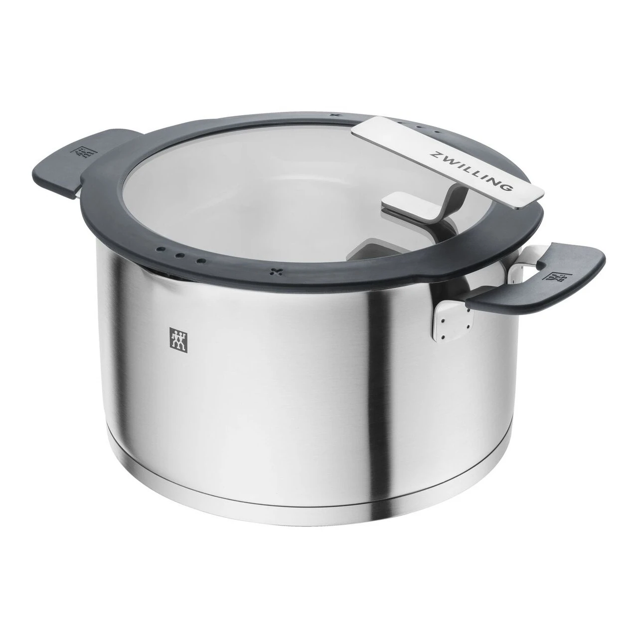 Take cooking to the next level: The large stock pot from the ZWILLING Simplify series combines function with design. Among the Simplify cookware series’ innovations is the wide range of functionality that the pot offers. The stock pot is made from matt 18/10 stainless steel, measures 24 cm across, holds 6 litres and is complemented by its soft-touch silicone details. Both the handles and the glass lid are covered with the grey silicone. A sieve in two different sizes is integrated in the silicone casing. This makes it easy to drain liquids without the need for an additional sieve. The X mark on the lid indicates the optimal lid position for reducing steam output when cooking. Another advantage is the stock pot’s SIGMA Classic + sandwich base, which ensures optimal heat distribution.
